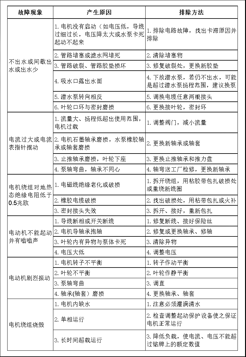 井用潛水泵的簡(jiǎn)介和使用條件 一、井用潛水泵簡(jiǎn)介 井用潛水電泵是一種新型提水機(jī)械,由潛水電機(jī)和潛水泵組成。它廣泛適用于農(nóng)田灌溉,城鄉(xiāng)生活區(qū)、工礦企業(yè)給排和建筑工程降水及河流、水庫、噴泉、制冷冷卻系統(tǒng)、溫泉浴場(chǎng)等各種水利工程設(shè)施。 該產(chǎn)品的主要特點(diǎn)是電機(jī)、水泵聯(lián)為一體潛入水中工作,使用、維修方便,效率高,運(yùn)轉(zhuǎn)安全可靠。 該產(chǎn)品執(zhí)行中華人民共和國(guó)國(guó)家標(biāo)準(zhǔn):①《小型潛水電泵GB/T25409-2010》;②《井用潛水異步電動(dòng)機(jī)GB/T2818-2014》;③《井用潛水泵GB/T2816-2014》。 二、使用條件 1. 電源:380V三相交流電,50HZ; 2. 水質(zhì):①水溫不高于20度(耐熱型80°C);②固體物含量(按質(zhì)量計(jì))不大于0.01%;③酸堿度(PH值)6.5-8.5;④硫化氫的含量不大于1.5mg/l;⑤氯離子的含量不大于400mg/l; 3. 潛水電機(jī)內(nèi)部必須充滿潔凈的清水;潛水電泵必須完全潛入水中工作; 4. 安裝深度不超過水泵額定揚(yáng)程±20%;要求井壁光滑正直,否則容易將水泵卡住。